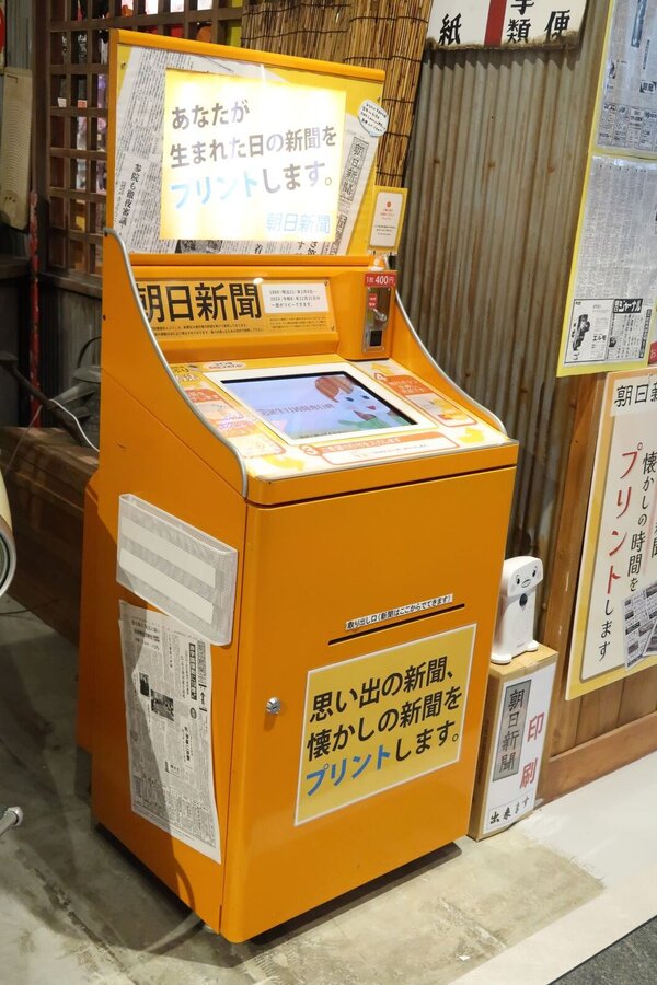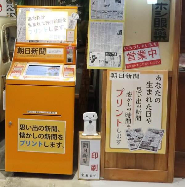 JRの二条駅前にある商業施設「BiVi二条店』の2階に「お誕生日新聞自動販売機」がある。明治21年以降の朝日新聞の一面またはテレビ面がプリントアウトできるので、自分が生まれた日がどんな年だったかを知ることができる。