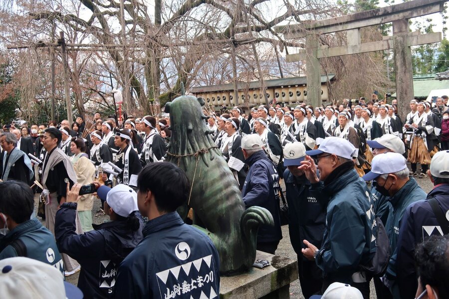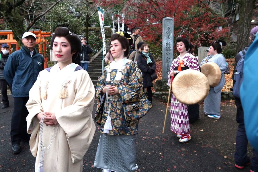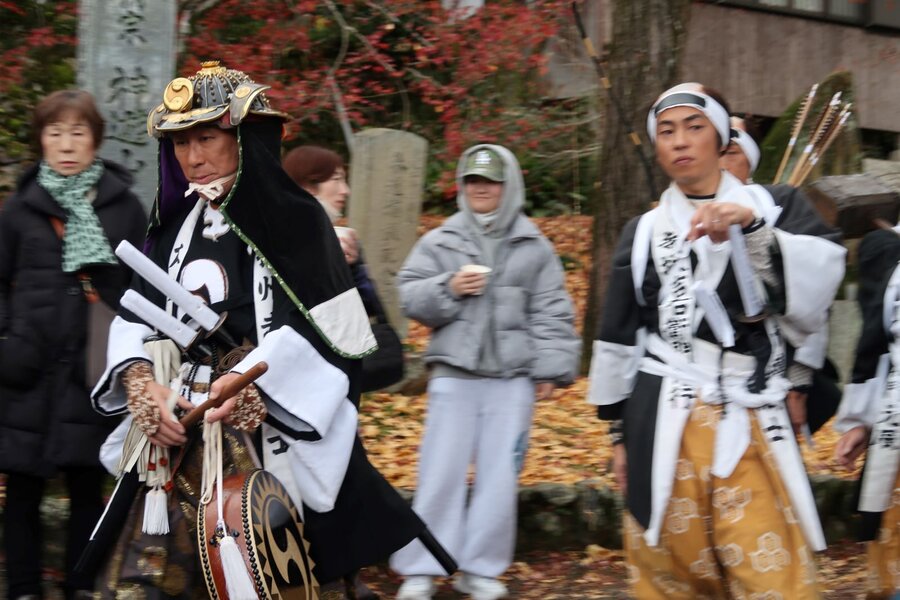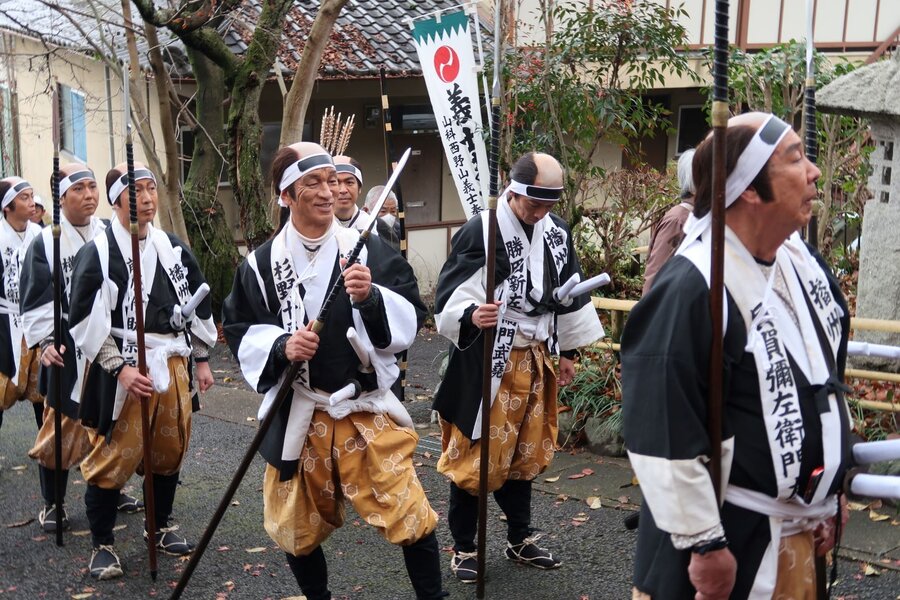山科義士祭は赤穂義士に扮した義士隊の行列が山科の毘沙門堂を出発して瑞光院、岩屋寺、大石神社などを練り歩くほか、京都市東文化会館で東映太秦映画村の協力により、松の廊下、切腹、連判状改め、討ち入りなどのお芝居や、大石神社では大石音頭・元禄花見踊りなどが披露された。今年は岩屋寺と大石神社での点描である。