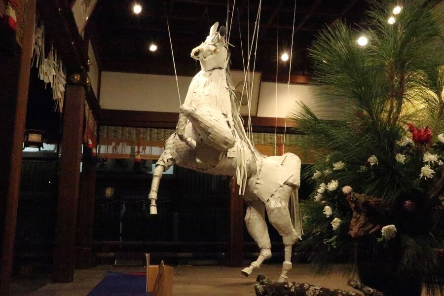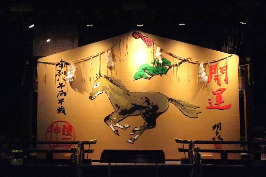 護王神社では、拝殿の「大絵馬」の西側に切り絵作家・田中道男氏の奉納による「天空馬」を展示しています。参拝の際に大絵馬だけに注目していますと、つい見落としがちなので念のために・・・。
