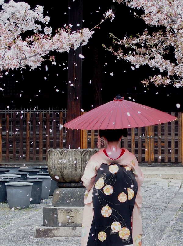 京都・立本寺の境内の桜吹雪です。艶やかな芸妓の帯などに、花びらのえくぼが・・。