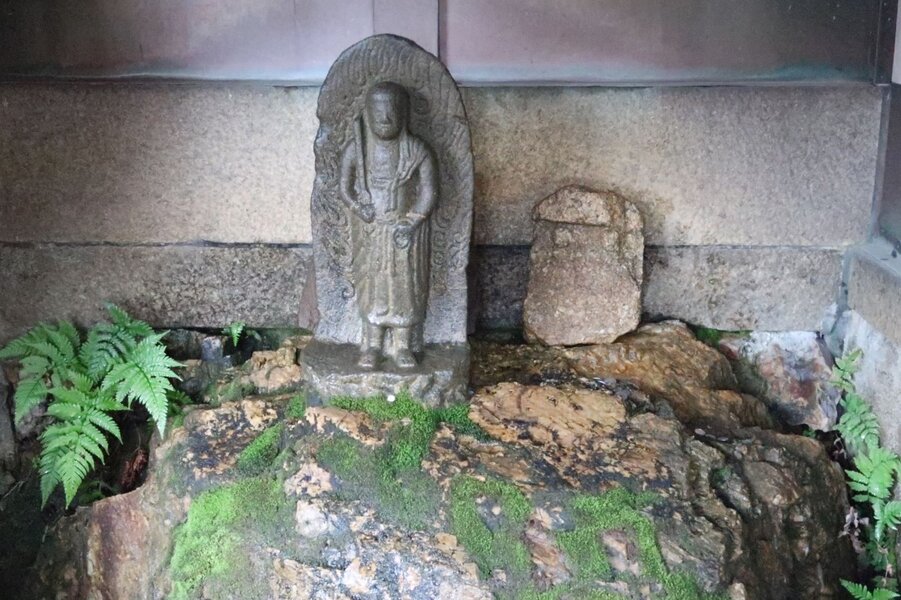 仁和寺の境内には、堀川の洪水で流された一条戻り橋の復旧工事で、橋の下から見つかったという石仏が祀られている。水を掛ければ一願だけ叶うという一願不動の信仰がある。石仏の台座の岩は、菅公が大宰府に向かう前に最後のお別れのご挨拶のため宇多法皇を訪ね、法皇の勤行が済むまでこの石に腰かけて待ったといわれる。